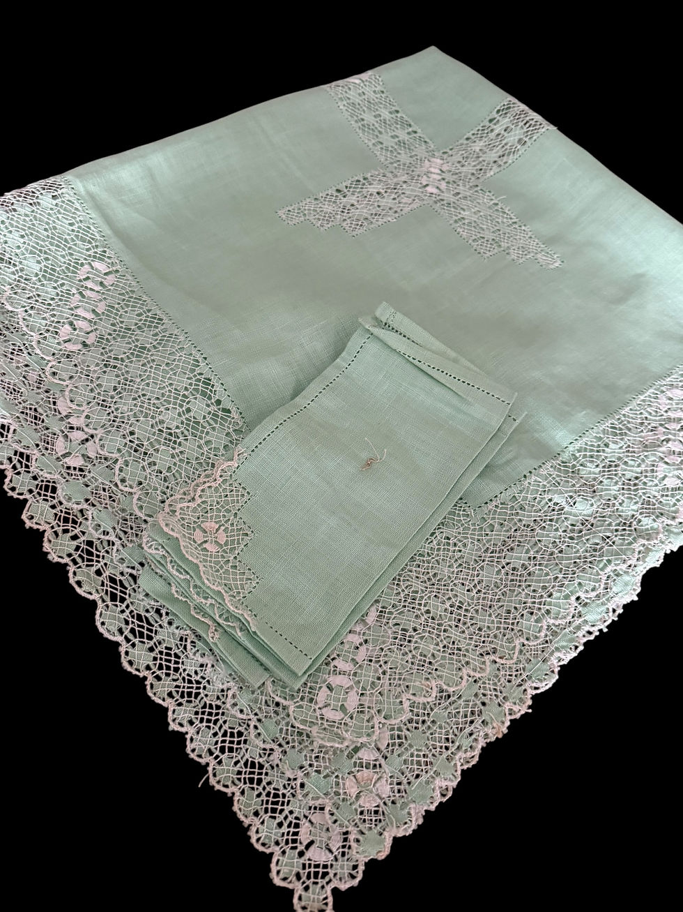 Vintage Tablecloth & Napkins. Green Cotton Lace